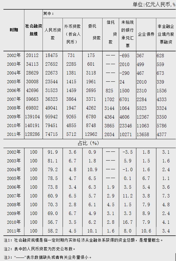 調(diào)查統(tǒng)計司負責人:統(tǒng)計數(shù)據(jù)顯示,2002年以來我國社會融資規(guī)?焖僭鲩L,有力地支持了我國經(jīng)濟持續(xù)平穩(wěn)較快發(fā)展。2002年到2011年間,我國社會融資規(guī)模由2萬億元擴大到12.83萬億元,年均增長22.9%,比同期人民幣各項貸款增長率高6.1個百分點。2011年社會融資規(guī)模與GDP之比為27.1%,比2002年提高10.4個百分點。