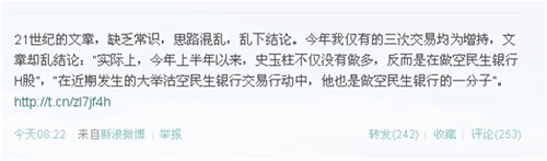 今日,某媒體以《史玉柱沽空民生銀行再調(diào)查港交所詳解淡倉規(guī)則》為題,發(fā)表了一篇內(nèi)容涉及質(zhì)疑史玉柱做空民生銀行H股的報道。對此,史玉柱連發(fā)三條微博,對報道做出回應(yīng),稱今年以來僅有三次交易,均為增持。
