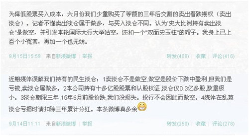 事實上,9月14日,該媒體就曾發(fā)表一篇題為《雙面史玉柱:民生銀行沽空真相調(diào)查》的報道,直指史玉柱事實上在做空民生銀行。對此,史玉柱也于當(dāng)日回應(yīng)稱,“近期媒體誤解我們持有的民生淡倉:賣淡倉不是做空,做空是股價下跌中盈利,但我們是虧錢,賣淡倉屬做多”。