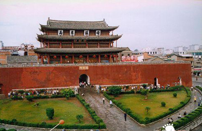 朝陽樓原名叫迎暉門,亦稱東門樓,始建于明朝洪武二十二年(1389年),比北京天安門早建28年,至今已有600多年的歷史,是祖國邊陲古老軍事重鎮(zhèn)的象征。600多年前,明軍平定云南后,設(shè)臨安衛(wèi),筑臨安城,并在四座城門上各建樓三層,東門叫迎暉門(即朝陽樓),南西北三城均毀于戰(zhàn)火,唯東門朝陽樓完好無損。朝陽樓樓層高24米,為三重檐歇山頂。檐角飛翹、畫棟雕梁、巍峨挺拔、氣勢雄偉。三樓屋檐下懸掛著“飛霞流云”、“雄鎮(zhèn)東南”的巨字匾額,是唯一幸存的清代四大榜書之一。