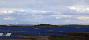 一座座亭亭玉立的風力發(fā)電機,一排排熠熠生輝的太陽能光伏電池板,構(gòu)成塞北高原一道奇異的風景。記者 杜躍進/攝 |