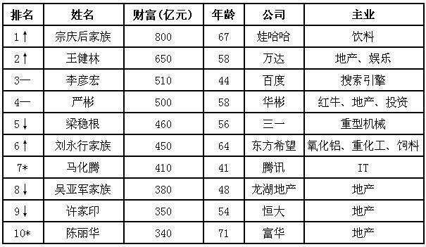 前10名中有2位新人,分別是排名第七的馬化騰和排名第十的陳麗華。來自房地產(chǎn)行業(yè)的富豪人數(shù)最多,達(dá)5位,比去年多一位。以飲料、IT為主業(yè)的富豪各有2位。平均年齡為56歲,比總榜大4歲。有3位做過百富榜的首富。