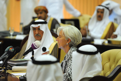 當?shù)貢r間10月6日,在沙特阿拉伯首都利雅得,國際貨幣基金組織總裁拉加德(中)在出席海合會財政部長會議后說,盛產石油的海合會成員國將保持高速經濟增長。她說,雖然2012年和2013年海合會經濟增速會有所減慢,但也將達到6.5%和5.6%。海合會成員國有沙特阿拉伯、阿聯(lián)酋、科威特、卡塔爾、阿曼和巴林。
