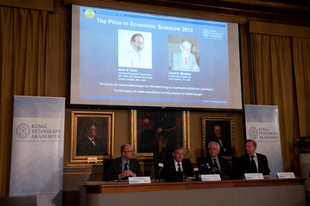 10月15日,在瑞典首都斯德哥爾摩,諾貝爾經(jīng)濟(jì)學(xué)獎(jiǎng)揭曉儀式現(xiàn)場的幻燈片展示獲獎(jiǎng)?wù)、美國?jīng)濟(jì)學(xué)家阿爾文·羅思(左)和勞埃德·沙普利的照片。 當(dāng)天,瑞典皇家科學(xué)院宣布將2012年諾貝爾經(jīng)濟(jì)學(xué)獎(jiǎng)授予美國經(jīng)濟(jì)學(xué)家阿爾文·羅思和勞埃德·沙普利。