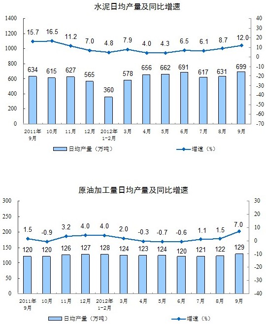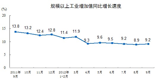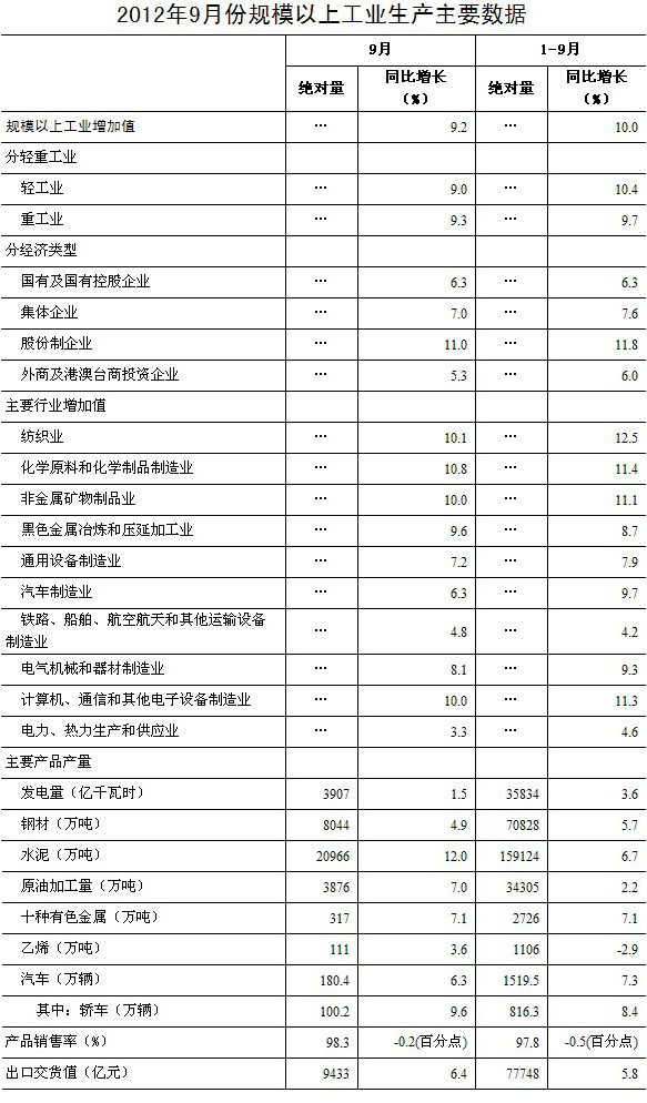 2012年9月份,規(guī)模以上工業(yè)增加值同比實(shí)際增長9.2%(以下增加值增速均為扣除價(jià)格因素的實(shí)際增長率),比8月份加快0.3個(gè)百分點(diǎn)。從環(huán)比看,9月份,規(guī)模以上工業(yè)增加值比上月增長0.79%。1-9月份,規(guī)模以上工業(yè)增加值同比增長10.0%。
