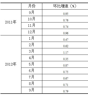 根據(jù)季節(jié)調(diào)整模型自動(dòng)修正結(jié)果,對(duì)2011年9月份至2012年8月份的規(guī)模以上工業(yè)增加值環(huán)比增速進(jìn)行修訂。修訂結(jié)果及2012年9月份環(huán)比數(shù)據(jù)如下: