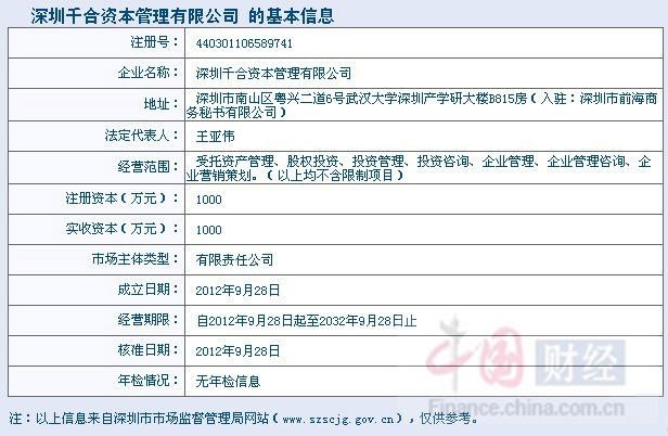 公開信息顯示,千合資本管理有限公司成立于2012年9月28日,注冊資本1000萬元,法人代表為王亞偉,公司地址位于深圳前海地區(qū),公司業(yè)務(wù)主要是受托資產(chǎn)管理、股權(quán)投資、投資管理、投資咨詢、企業(yè)管理、企業(yè)管理咨詢、企業(yè)營銷策劃。