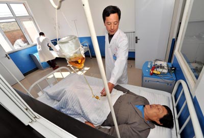 被稱為“炕頭醫(yī)”的村醫(yī)以前走街闖巷入戶行醫(yī)問診,現(xiàn)在已經(jīng)在寬敞明亮、環(huán)境衛(wèi)生、硬件齊全的村衛(wèi)生室值班坐診。天津已建成2542所村衛(wèi)生室,預(yù)計(jì)到年底天津農(nóng)村將在全國(guó)率先實(shí)現(xiàn)村村都有衛(wèi)生室。圖為天津市寧河縣寧河鎮(zhèn)小月河村衛(wèi)生室村醫(yī)張華兵在給患有高血脂的董克茵輸液。