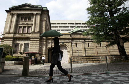 22日,日本央行在各分行行長季度會議上公布10月份季度性區(qū)域報告,下調(diào)了日本9個地區(qū)中8個地區(qū)的經(jīng)濟評估。日本央行行長白川方明在會議上表示,將通過穩(wěn)步擴大資產(chǎn)購買計劃規(guī)模繼續(xù)放松貨幣政策。 圖為一行人經(jīng)過日本央行大樓。