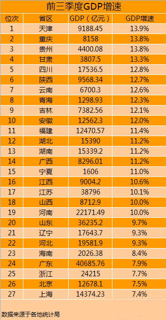 近期各地陸續(xù)公布了前三季度GDP(國內(nèi)生產(chǎn)總值)數(shù)據(jù),據(jù)中新網(wǎng)財經(jīng)頻道統(tǒng)計,截至10月28日,全國已有27個省(自治區(qū)、直轄市)公布了前三季度GDP增速。其中,天津增速最高,為13.9%,重慶和貴州以13.8%的增速并列第二,而上海以7.4%的增速墊底。
