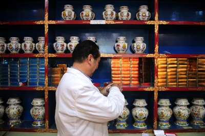 藏醫(yī)藥在甘肅省甘南藏族自治州發(fā)展已經(jīng)有1000多年的歷史。近年來,在保持藏醫(yī)藥古老傳統(tǒng)的同時,當(dāng)?shù)爻浞滞诰蜓芯坎蒯t(yī)藥在治療心腦血管疾病、消化系統(tǒng)疾病、婦科病及高原病等方面的潛力和優(yōu)勢,形成科學(xué)規(guī)范系統(tǒng)的診斷治療標準。根據(jù)甘南藏區(qū)牧民喜歡中藏藥治療的特點,甘南及時調(diào)整了補償方案,降低了中藏藥起付線,提高了中藏藥的報銷比例,推行門診統(tǒng)籌。符合國家及甘肅省衛(wèi)生廳下發(fā)中藏藥目錄的藥物,參合農(nóng)牧民在各級定點醫(yī)療機構(gòu)住院都可實行100%全額報銷,使中藏醫(yī)藥特色服務(wù)普及全州。圖為甘肅省甘南藏族自治州藏醫(yī)藥研究院附屬醫(yī)院院長虎玉成正在藥劑室內(nèi)調(diào)配藏藥。