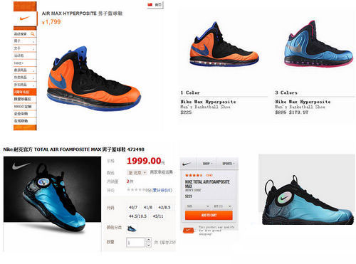 MAX的耐克男子籃球鞋,在天貓商城的耐克官方旗艦店的售價更是高達1999元人民幣。而在其美國官網(wǎng)上,該產品的售價同樣僅為225美元,約合人民幣1409元。該產品在國內的售價也高出其在美國售價的40%。