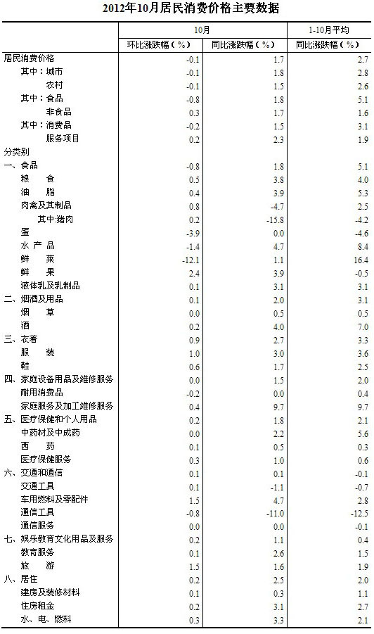 2012年10月份,全國居民消費價格總水平同比上漲1.7%(創(chuàng)33個月以來新低)。其中,城市上漲1.8%,農村上漲1.5%;食品價格上漲1.8%,非食品價格上漲1.7%;消費品價格上漲1.5%,服務項目價格上漲2.3%。1-10月平均,全國居民消費價格總水平比去年同期上漲2.7%。
