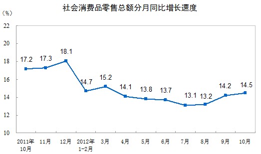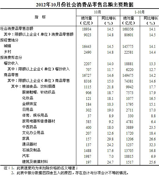 2012年10月份,社會消費(fèi)品零售總額18934億元,同比名義增長14.5%(扣除價格因素實際增長13.5%,以下除特殊說明外均為名義增長)。其中,限額以上企業(yè)(單位)消費(fèi)品零售額9023億元,增長14.8%。1-10月份,社會消費(fèi)品零售總額168356億元,同比名義增長14.1%(扣除價格因素實際增長11.8%)。從環(huán)比看,10月份社會消費(fèi)品零售總額增長1.34%。