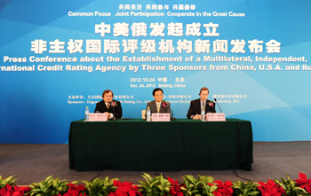 大公國際資信評估有限公司總裁關建中(中)、美國伊根-瓊斯評級公司總裁肖恩·伊根(右)、俄羅斯信用評級公司總裁理查德·海恩斯沃茨(左)共同出席新聞發(fā)布會 |