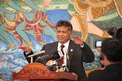 11月18日,在柬埔寨首都金邊,東盟秘書(shū)長(zhǎng)素林在新聞發(fā)布會(huì)上講話(huà)。素林表示,盡管面臨諸多挑戰(zhàn),東盟領(lǐng)導(dǎo)人普遍認(rèn)為東盟一體化進(jìn)程進(jìn)展順暢,有信心在2015年建成東盟經(jīng)濟(jì)共同體。當(dāng)日,第21屆東盟峰會(huì)在柬埔寨首都金邊開(kāi)幕。與會(huì)東盟領(lǐng)導(dǎo)人將重點(diǎn)討論深化區(qū)域合作、推進(jìn)區(qū)域一體化進(jìn)程、世界經(jīng)濟(jì)恢復(fù)乏力帶來(lái)的諸多全球性挑戰(zhàn)等重大問(wèn)題。