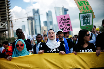 圖為多哈氣候大會會場外,示威者呼吁發(fā)達國家盡快采取行動應對氣候變化。