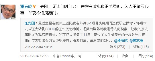 汪先剛的微博原文為:最近復(fù)星在媒體上誣陷我在外灘8-1項(xiàng)目談判期間違反職業(yè)操守,懷疑本人從證大轉(zhuǎn)到SOHO的工作變動(dòng)動(dòng)機(jī),還鼓動(dòng)媒體對(duì)我進(jìn)行人肉搜索,讓我的家人和朋友為我深感擔(dān)憂。我在證大服務(wù)了11年,度過了人生最美好的一段時(shí)光,感謝兩位老板出頭為我證明清白,清者自清,請(qǐng)朋友們放心。