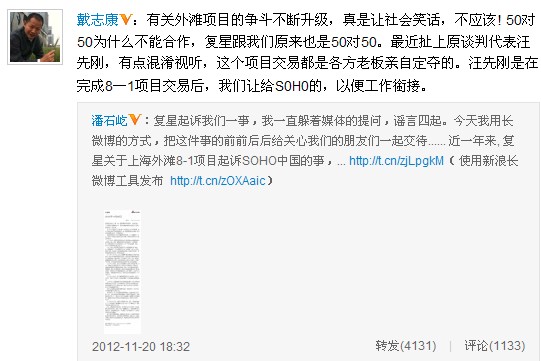 郭廣昌的這番言論引起了媒體的猜測(cè)。今天,潘石屹和戴志康在微博上雙雙否認(rèn)此事。戴志康認(rèn)為復(fù)星是混淆視聽,他說,這個(gè)項(xiàng)目交易都是各方老板親自定奪的,而汪先剛是在完成8一1項(xiàng)目交易后,證大才讓給S0H0中國(guó)的,以便工作銜接。