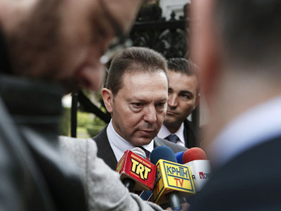 圖為希臘財政部長斯圖納拉斯當(dāng)天在一次會議后接受采訪。