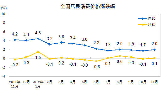 2012年11月份,全國居民消費價格總水平同比上漲2.0%。其中,城市上漲2.1%,農村上漲1.9%;食品價格上漲3.0%,非食品價格上漲1.6%;消費品價格上漲1.9%,服務項目價格上漲2.3%。1-11月平均,全國居民消費價格總水平比去年同期上漲2.7%。
