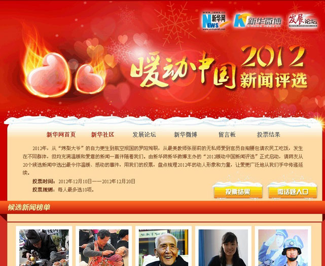 從“烤梨大爺”的自力更生到航空報國的羅陽殉職,從最美教師張麗莉的無私師愛到官員自掏腰包請農(nóng)民工吃飯,發(fā)生在不同群體,但均充滿溫暖和愛意的新聞一直伴隨著你我,讓我們通過票選的形式共同盤點梳理2012年的動人形象和力量,讓愛通過網(wǎng)絡(luò)渠道更廣泛地從每個人手中延續(xù)。本次活動投票期為2012年12月10日—2012年12月20日,網(wǎng)友可登錄新華網(wǎng)(www.xinhuanet.com/forum/zt2012/wbndzg/index.htm)參與投票,并登錄新華微博(t.home.news.cn)參與微話題#2012暖動中國新聞評選#討論。