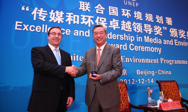 12月14日,聯(lián)合國環(huán)境規(guī)劃署在北京舉行“傳媒和環(huán)保卓越領(lǐng)導(dǎo)獎”頒獎典禮。新華社社長李從軍因?yàn)閷θ颦h(huán)保事業(yè)的努力,成為這一獎項(xiàng)的首位得主。這是聯(lián)合國副秘書長兼聯(lián)合國環(huán)境規(guī)劃署執(zhí)行主任施泰納為李從軍頒獎。