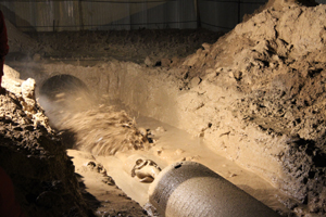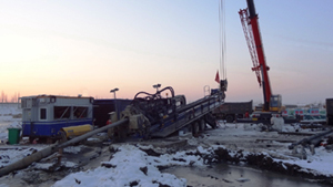泥漿是定向穿越中的關(guān)鍵因素,被視為定向鉆的“血液”。圖為在泥漿中回拖預(yù)置管線入洞。 |