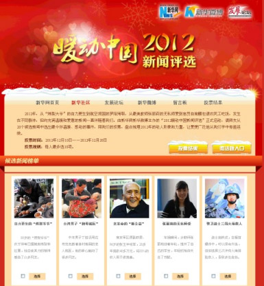 當(dāng)選“2012十大暖動(dòng)中國(guó)新聞”的分別是: