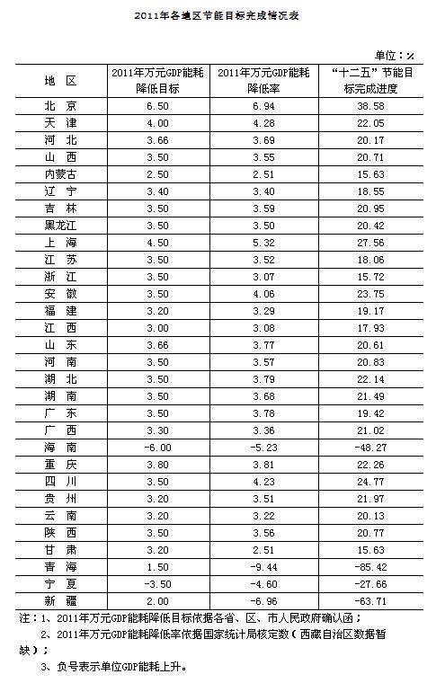 超額完成的地區(qū)有北京、天津、河北、山西、上海、山東、河南、湖北、四川、貴州10個省(市);完成的地區(qū)有吉林、黑龍江、安徽、湖南、廣西、重慶、云南、陜西8個省(區(qū)、市);完成了年度節(jié)能目標但落后于“十二五”節(jié)能目標進度的地區(qū)有內(nèi)蒙古、遼寧、江蘇、福建、江西、廣東6個省(區(qū));未完成的地區(qū)有浙江、海南、甘肅、青海、寧夏、新疆6個省(區(qū)),其中青海因玉樹地震災害的影響未完成年度節(jié)能目標。