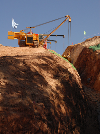 圖為云南南華縣沙橋鎮(zhèn)下王村東南一處陡坡上,中石油管道局二公司CPP220機組施工現(xiàn)場。記者 李新民/攝 |