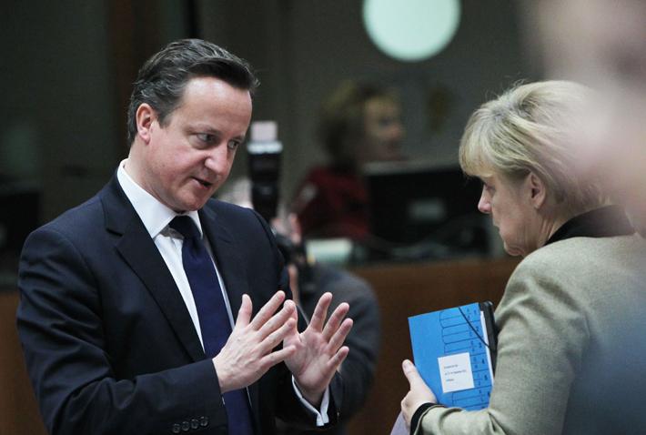 2012年12月14日,在比利時首都布魯塞爾舉行的歐盟峰會第二天會議上,英國首相卡梅倫(左)與德國總理默克爾交談。新華社記者