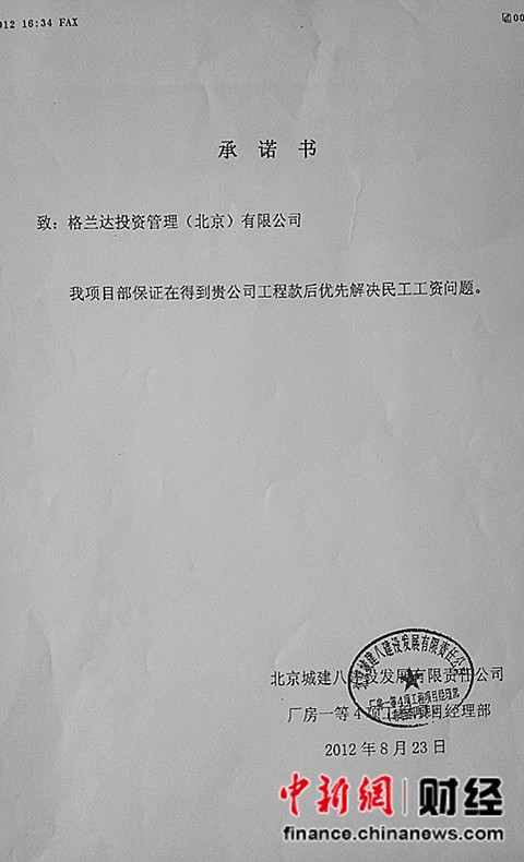 關(guān)于解決農(nóng)民工工資問題城建八致格蘭達承諾書