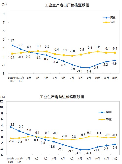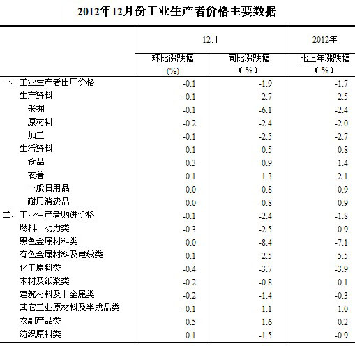 2012年12月份,全國工業(yè)生產(chǎn)者出廠價(jià)格同比下降1.9%,環(huán)比下降0.1%。工業(yè)生產(chǎn)者購進(jìn)價(jià)格同比下降2.4%,環(huán)比下降0.1%。2012年,工業(yè)生產(chǎn)者出廠價(jià)格比上年下降1.7%,工業(yè)生產(chǎn)者購進(jìn)價(jià)格比上年下降1.8%。