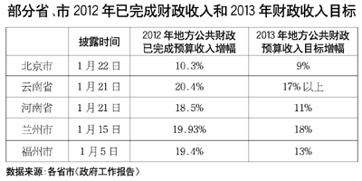 調低財政收入增長目標的不止合肥市,北京市的《政府工作報告》顯示,過去五年,地方公共財政預算收入達到3314.9億元,年均增長17.3%。而2013年全市經濟社會發(fā)展主要預期目標中,地方公共財政預算收入增長9%,這也比去年的預算目標再次調低了1個百分點。另外,天津、浙江也將2013年地方公共財政收入目標分別調整為12%和8%,比2012年分別下降3個和0.5個百分點。