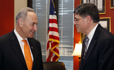美國參議員、民主黨人舒默(左)22日在華盛頓國會山與獲得財長提名的雅克布·盧會談,雙方就提高美國債務(wù)上限的相關(guān)問題進(jìn)行了討論。當(dāng)日,美國白宮發(fā)言人卡尼表示,如果共和黨提出的公共債務(wù)上限短期調(diào)高方案能得到國會批準(zhǔn),美國總統(tǒng)奧巴馬會將其簽署成為法案。