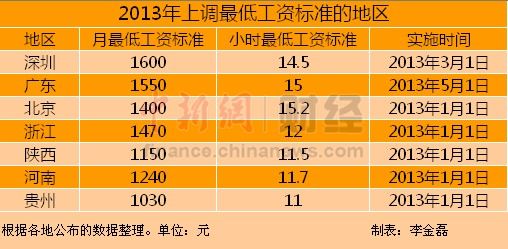 其中,2月5日,深圳市公布了2013年最低工資標準:全日制就業(yè)勞動者最低工資標準為1600元/月;非全日制就業(yè)勞動者小時最低工資標準為14.5元/小時。新標準自2013年3月1日起實施。