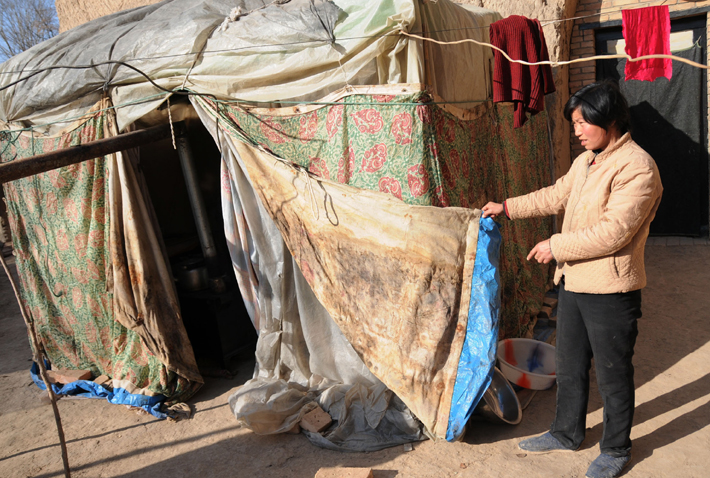 由于擔(dān)心危窯坍塌,常小萍和丈夫在院子里用塑料、破布搭了一大一小兩頂簡(jiǎn)易帳篷,在慶陽市政府除夕發(fā)放救災(zāi)帳篷之前,常小萍夫婦已經(jīng)在里面住了一個(gè)多月。