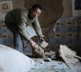 | 平泉鎮(zhèn)洪水村村民焦武合在收拾震塌的窯洞。 |