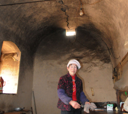 | 鎮(zhèn)原縣平泉鎮(zhèn)麻王村村民張清芳在自家廚窯里收拾案板,她頭頂窯背上一條長(zhǎng)長(zhǎng)的裂縫是石油勘探放炮時(shí)震出的。 |