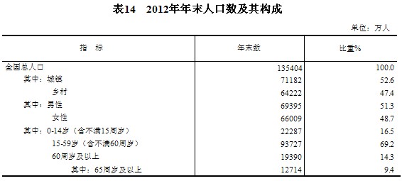 年末全國大陸總?cè)丝跒?35404萬人,比上年末增加669萬人,其中城鎮(zhèn)人口為71182萬人,占總?cè)丝诒戎貫?2.6%,比上年末提高1.3個百分點(diǎn)。全年出生人口1635萬人,出生率為12.10‰;死亡人口966萬人,死亡率為7.15‰;自然增長率為4.95‰。出生人口性別比為117.70。0-14歲(含不滿15周歲)人口22287萬人,占總?cè)丝诘?6.5%,比上年末提高0.01個百分點(diǎn);15-59歲(含不滿60周歲)勞動年齡人口93727萬人,比上年末減少345萬人,占總?cè)丝诘?9.2%,比上年末下降0.60個百分點(diǎn);60周歲及以上人口19390萬人,占總?cè)丝诘?4.3%,比上年末提高0.59個百分點(diǎn)。全國人戶分離的人口[25]為2.79億人,其中流動人口[26]為2.36億人。