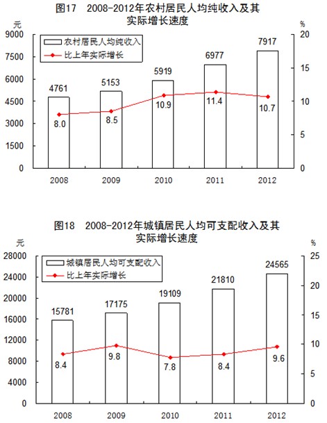 全年農(nóng)村居民人均純收入7917元,比上年增長13.5%,扣除價格因素,實(shí)際增長10.7%;農(nóng)村居民人均純收入中位數(shù)[27]為7019元,增長13.3%。城鎮(zhèn)居民人均可支配收入24565元,比上年增長12.6%,扣除價格因素,實(shí)際增長9.6%;城鎮(zhèn)居民人均可支配收入中位數(shù)為21986元,增長15.0%。農(nóng)村居民食品消費(fèi)支出占消費(fèi)總支出的比重為39.3%,城鎮(zhèn)為36.2%。
