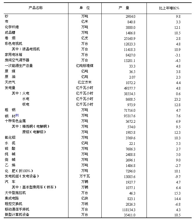 全年規(guī)模以上工業(yè)[7]中,農副食品加工業(yè)增加值比上年增長13.6%,紡織業(yè)增長12.2%,通用設備制造業(yè)增長8.4%,專用設備制造業(yè)增長8.9%,汽車制造業(yè)增長8.4%,計算機、通信和其他電子設備制造業(yè)增長12.1%,電氣機械和器材制造業(yè)增長9.7%。六大高耗能行業(yè)[8]增加值比上年增長9.5%,其中,非金屬礦物制品業(yè)增長11.2%,化學原料和化學制品制造業(yè)增長11.7%,有色金屬冶煉和壓延加工業(yè)增長13.2%,黑色金屬冶煉和壓延加工業(yè)增長9.5%,電力、熱力生產和供應業(yè)增長5.0%,石油加工、煉焦和核燃料加工業(yè)增長6.3%。高技術制造業(yè)增加值比上年增長12.2%。
