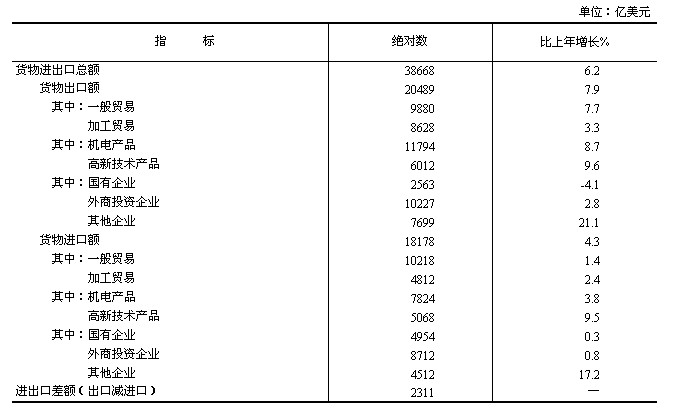 全年貨物進出口總額38668億美元,比上年增長6.2%。其中,出口20489億美元,增長7.9%;進口18178億美元,增長4.3%。進出口差額(出口減進口)2311億美元,比上年增加762億美元。