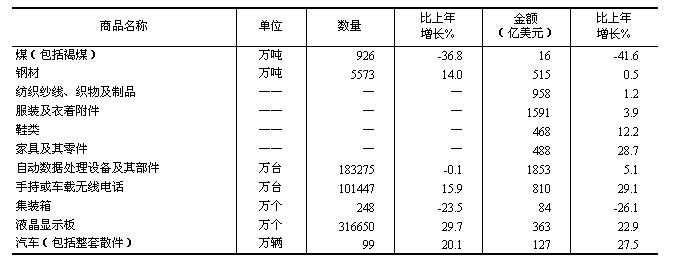 表7 2012年主要商品出口數量、金額及其增長速度