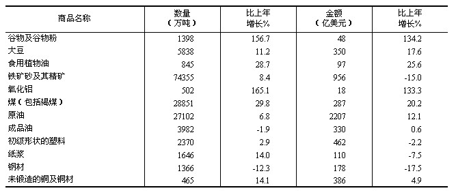 表8 2012年主要商品進口數量、金額及其增長速度