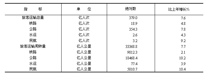 全年旅客運輸總量379億人次,比上年增長7.6%。旅客運輸周轉量33369億人公里,增長7.7%。