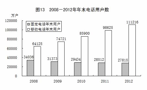 全年完成郵電業(yè)務總量[14]15022億元,比上年增長13.0%。其中,郵政業(yè)務總量2037億元,增長26.7%;電信業(yè)務總量12985億元,增長11.1%。郵政業(yè)全年完成郵政函件業(yè)務70.74億件,包裹業(yè)務0.69億件,快遞業(yè)務量56.85億件。電信業(yè)全年局用交換機容量新增478萬門,總容量43906萬門;新增移動電話交換機容量[15]11234萬戶,達到182870萬戶。年末固定電話用戶27815萬戶,其中,城市電話用戶18893萬戶,農村電話用戶8922萬戶。新增移動電話用戶12590萬戶,年末達到111216萬戶,其中3G移動電話用戶[16]23280萬戶。年末全國固定及移動電話用戶總數達到139031萬戶,比上年末增加11896萬戶。電話普及率達到103.2部/百人;ヂ(lián)網上網人數5.64億人,其中寬帶上網人數5.30億人;ヂ(lián)網普及率達到42.1%。