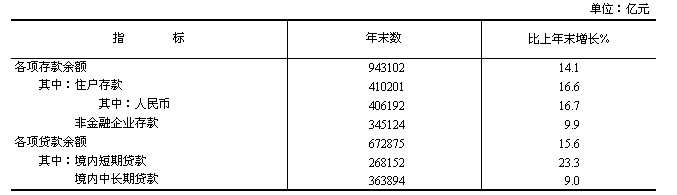 年末全部金融機構本外幣各項存款余額94.3萬億元,比年初增加11.6萬億元,其中人民幣各項存款余額91.8萬億元,增加10.8萬億元。全部金融機構本外幣各項貸款余額67.3萬億元,增加9.1萬億元,其中人民幣各項貸款余額63.0萬億元,增加8.2萬億元。全年社會融資規(guī)模[17]為15.8萬億元,按可比口徑計算,比上年多2.9萬億元。