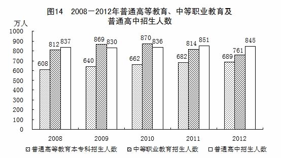 全年研究生教育招生59.0萬人,在學研究生172.0萬人,畢業(yè)生48.6萬人。普通高等教育本?普猩688.8萬人,在校生2391.3萬人,畢業(yè)生624.7萬人。各類中等職業(yè)教育招生761.0萬人,在校生2120.3萬人,畢業(yè)生673.6萬人。全國普通高中招生844.6萬人,在校生2467.2萬人,畢業(yè)生791.5萬人。全國初中招生1570.8萬人,在校生4763.1萬人,畢業(yè)生1660.8萬人。普通小學招生1714.7萬人,在校生9695.9萬人,畢業(yè)生1641.6萬人。特殊教育招生6.6萬人,在校生37.9萬人,畢業(yè)生4.9萬人。幼兒園在園幼兒3685.8萬人。